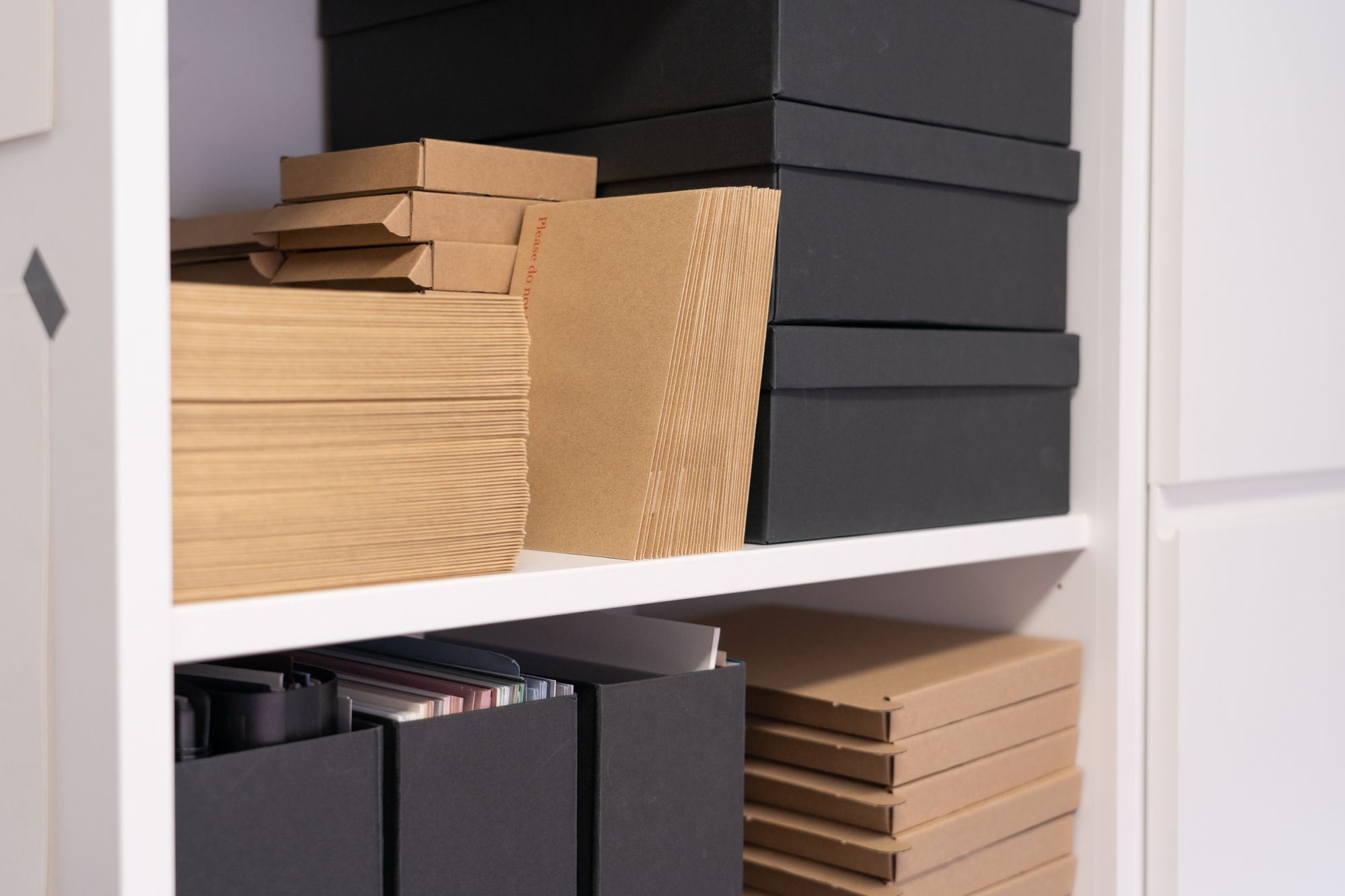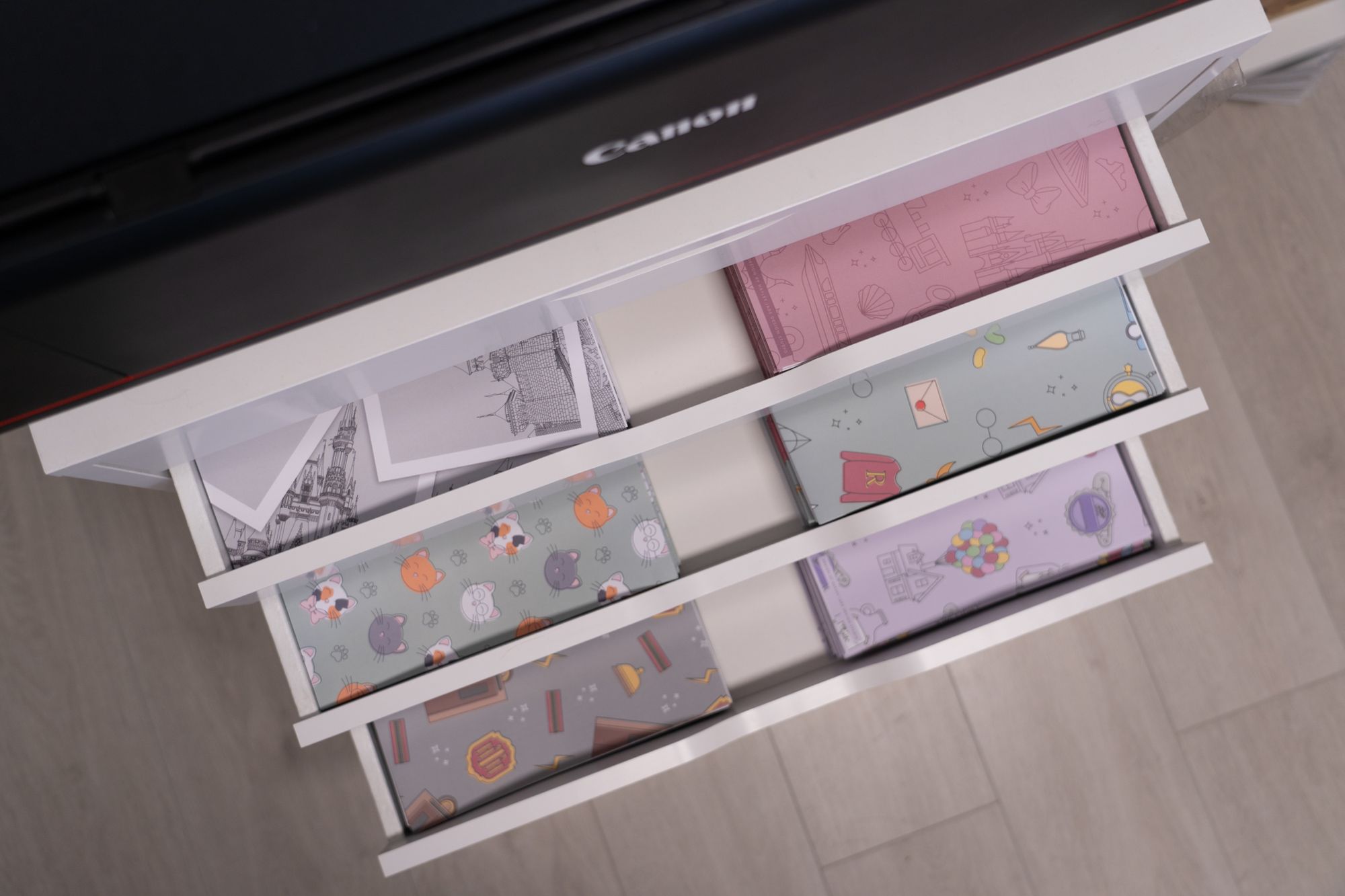 Opposite is the cupboard and shelving and my printer. Obviously the printer is my pride and joy and something I couldn't run my business without. I’ve written another post about my small business essentials with more information on it. The printer is sat on yet more drawers (can never have enough!), which hold more paper stock and my wrapping paper, whilst the shelves hold all the packing essentials from postal envelopes and boxes, to branded stickers. The idea was to have the shelves open so that I can just grab the packaging as and when I need it, and not have to either have a cupboard door open all the time and getting in the way or keep opening it!