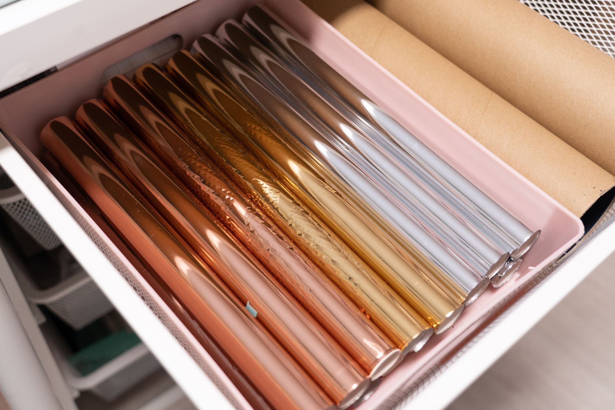 Underneath the desks is where i store all my cut to size paper in drawers, alongside my basket drawers where I use some of my pink storage basket/trays (I have so many of them! They're from Dunelm btw) to store bits like rolls of foil.