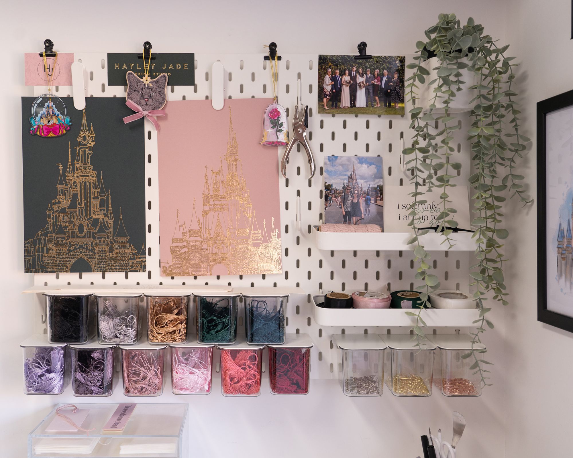 Adding the pegboard was a great storage solution, it's meant I can add smaller bits like tassels and ribbon within easy reach when I need them. Of course I had to add some personal touches and fake plants to pretty-fy it!