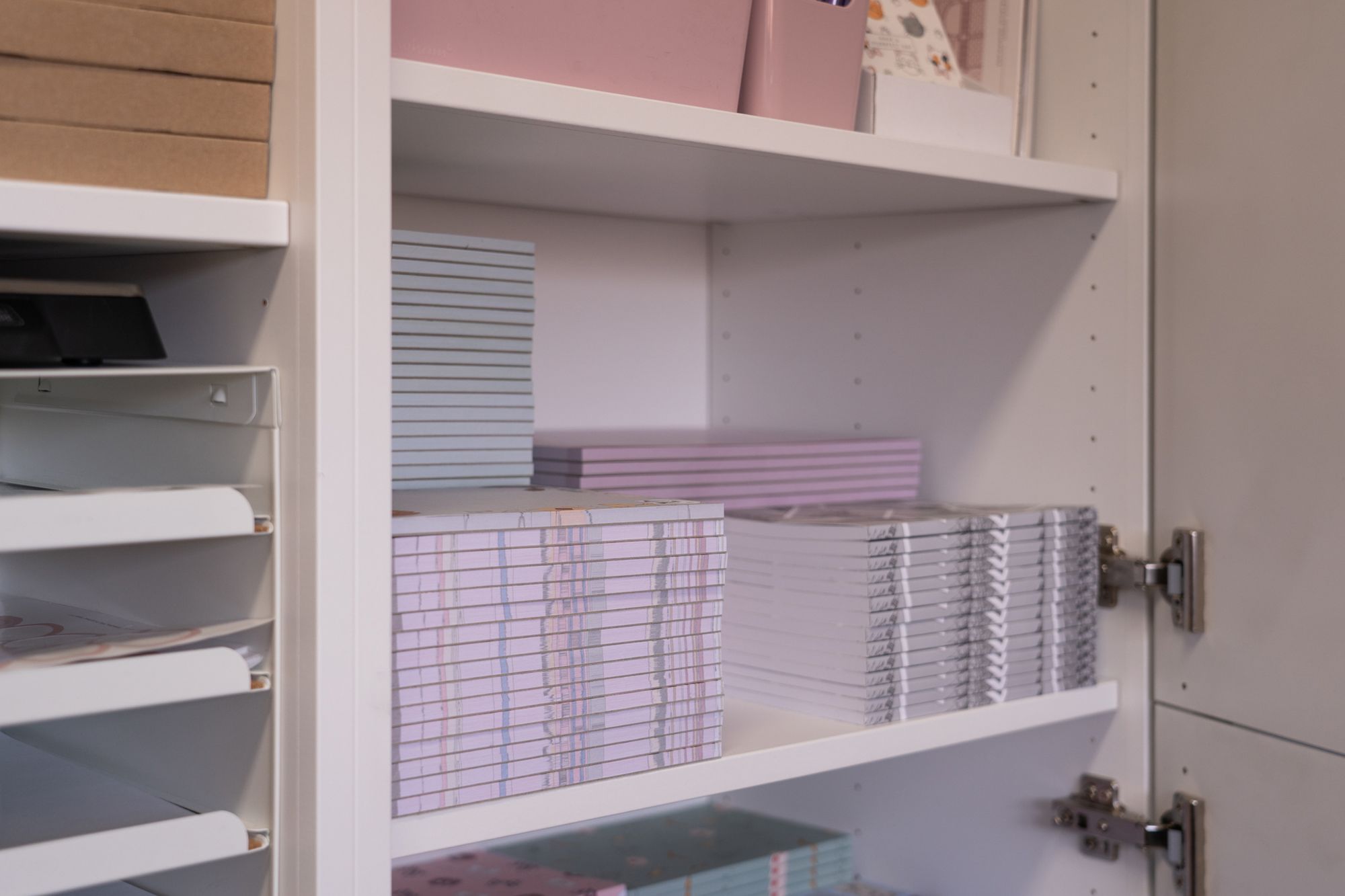 The cupboard side holds the items I have in stock such as notepads, and things like envelopes and my bookmarks - all of course stored in those pink trays which you can just see in the photo above. I like to have all these in a cupboard to avoid any dust or potential light bleaching. I try to put as much stuff in cupboards, drawers or boxes for this reason. I don't like having too much stuff hanging around as it makes the room look a mess and I hate mess - I assure you my office doesn't look this tidy about 90% off the time!