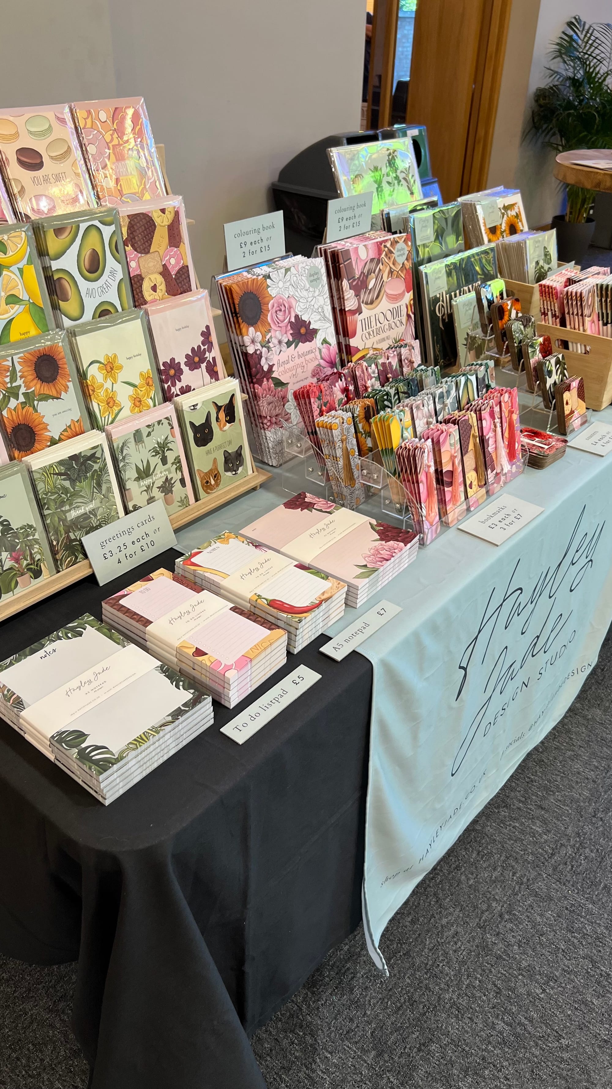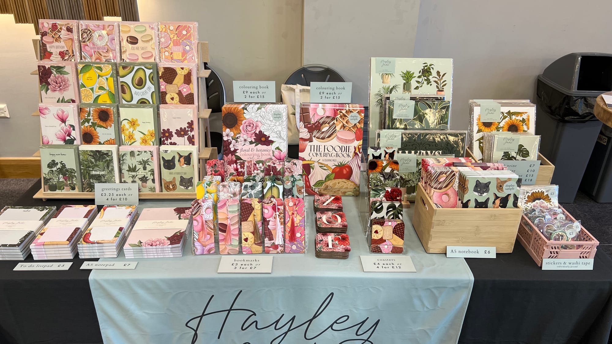 I feel like I was pretty happy with the layout. What was great was the stand the cards are on. I bought it from a seller on Etsy and it was great for adding some height to the table as well as being flat packed! I was using a wire display rack before and it was just a bit too bulky to take, and the new one fits perfectly into my boxes of stock (and hopefully a suitcase for one of my next markets 🤞). I've actually bought another one of these stands which I'll probably display some prints on!