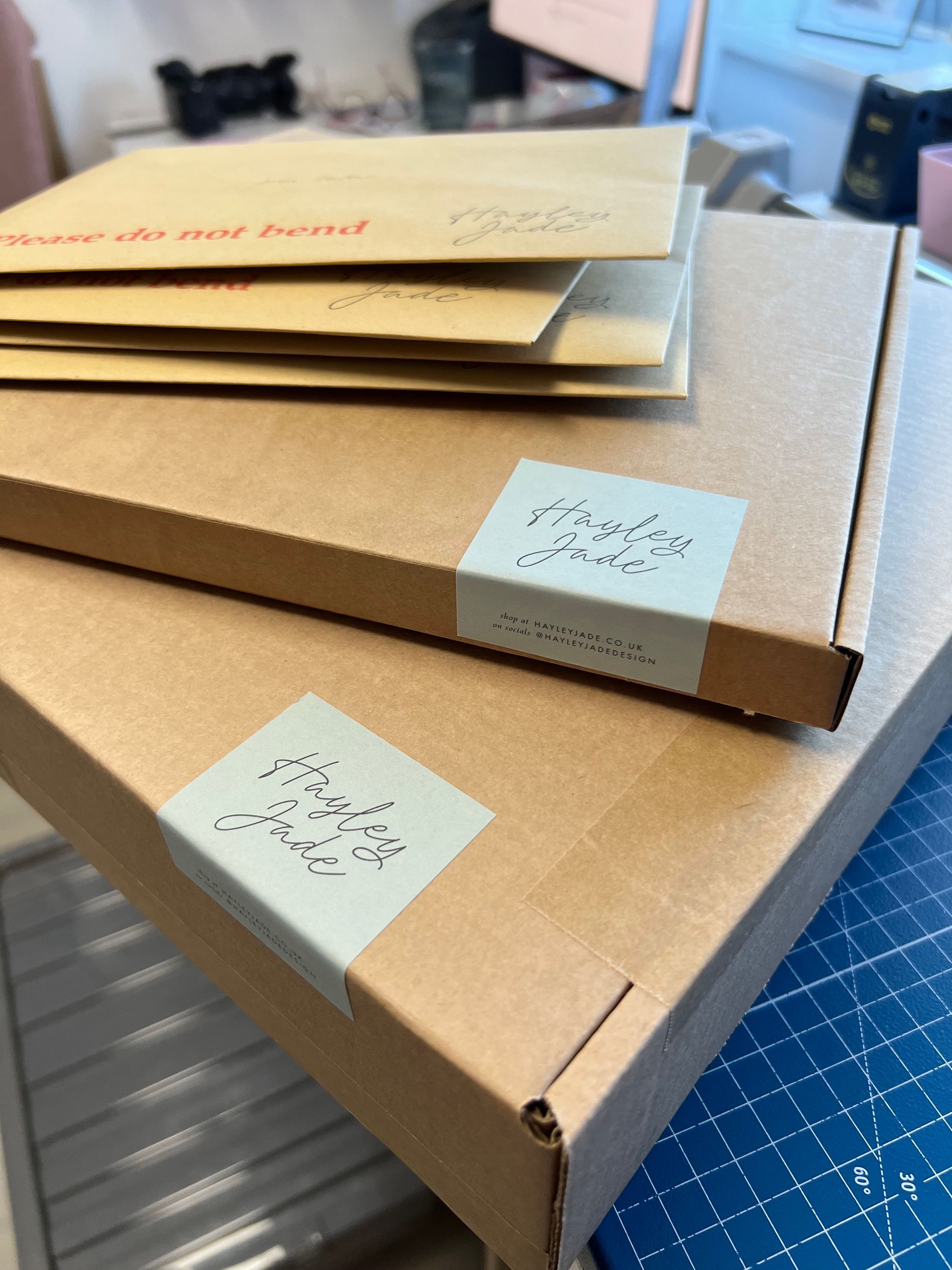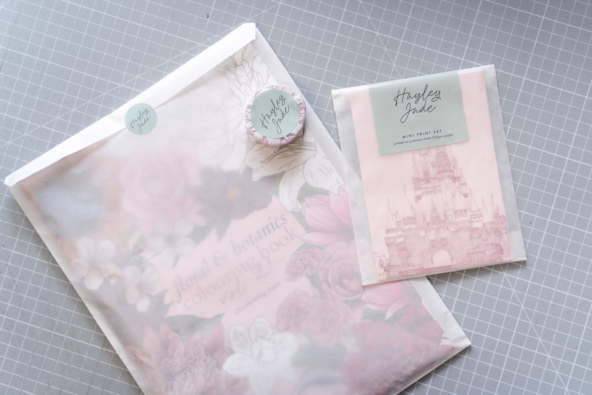 For products such as mini prints, cards, bookmarks and individual orders of a print or a colouring book for example, I use glassine envelopes which I absolutely love. They're obviously a little pricier than using cello bags or tissue paper, but I also think they make the product nicely presented too. And you can get them in a whole range of sizes, I have ones up to C4 that fit calendars and the 21x30cm prints.