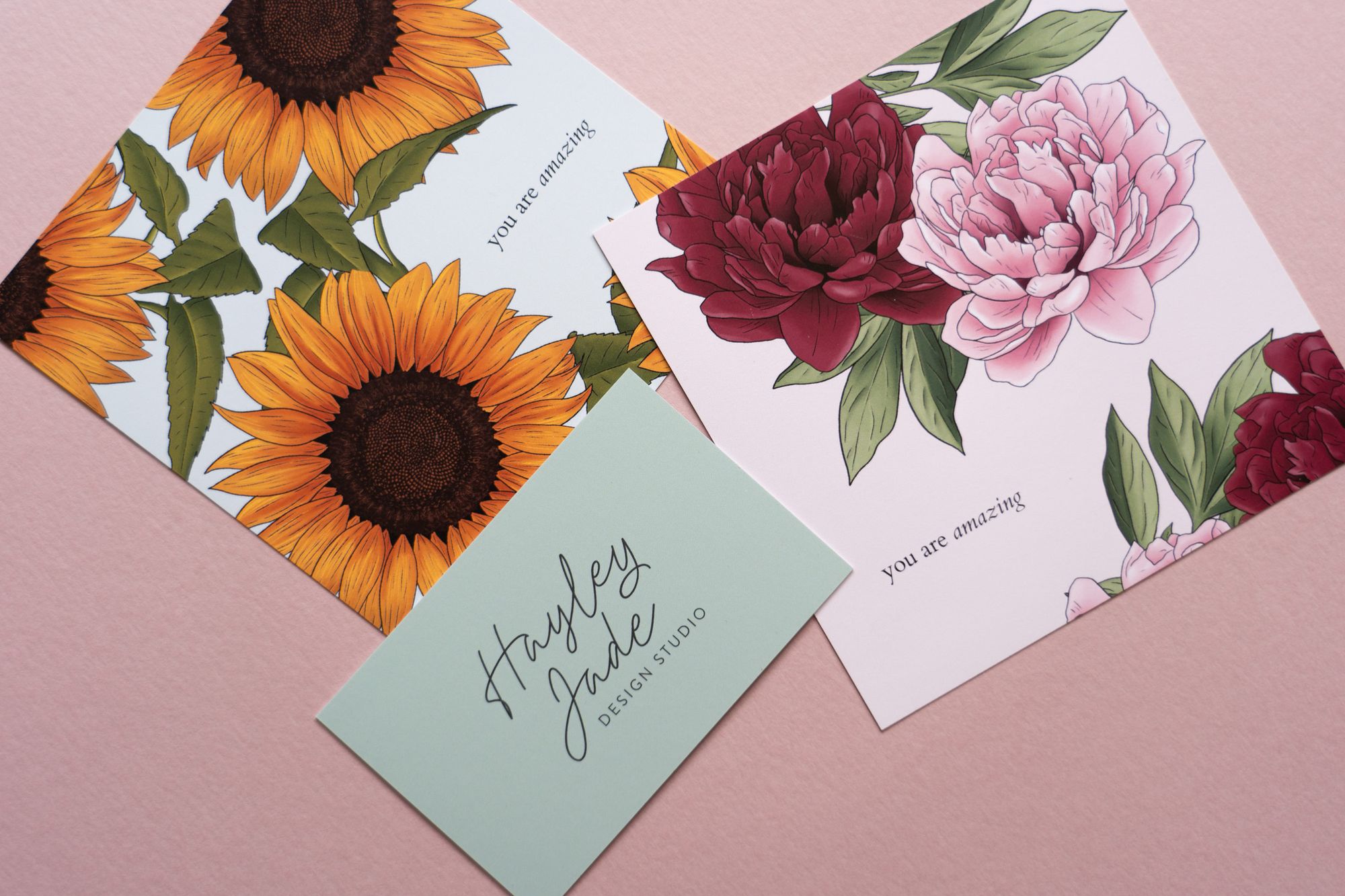 And because my main focus is now on my illustrative drawings, I had to include them on the new thank you cards. The peony and sunflower designs have each got their own little collection coming, so I just had to choose those!