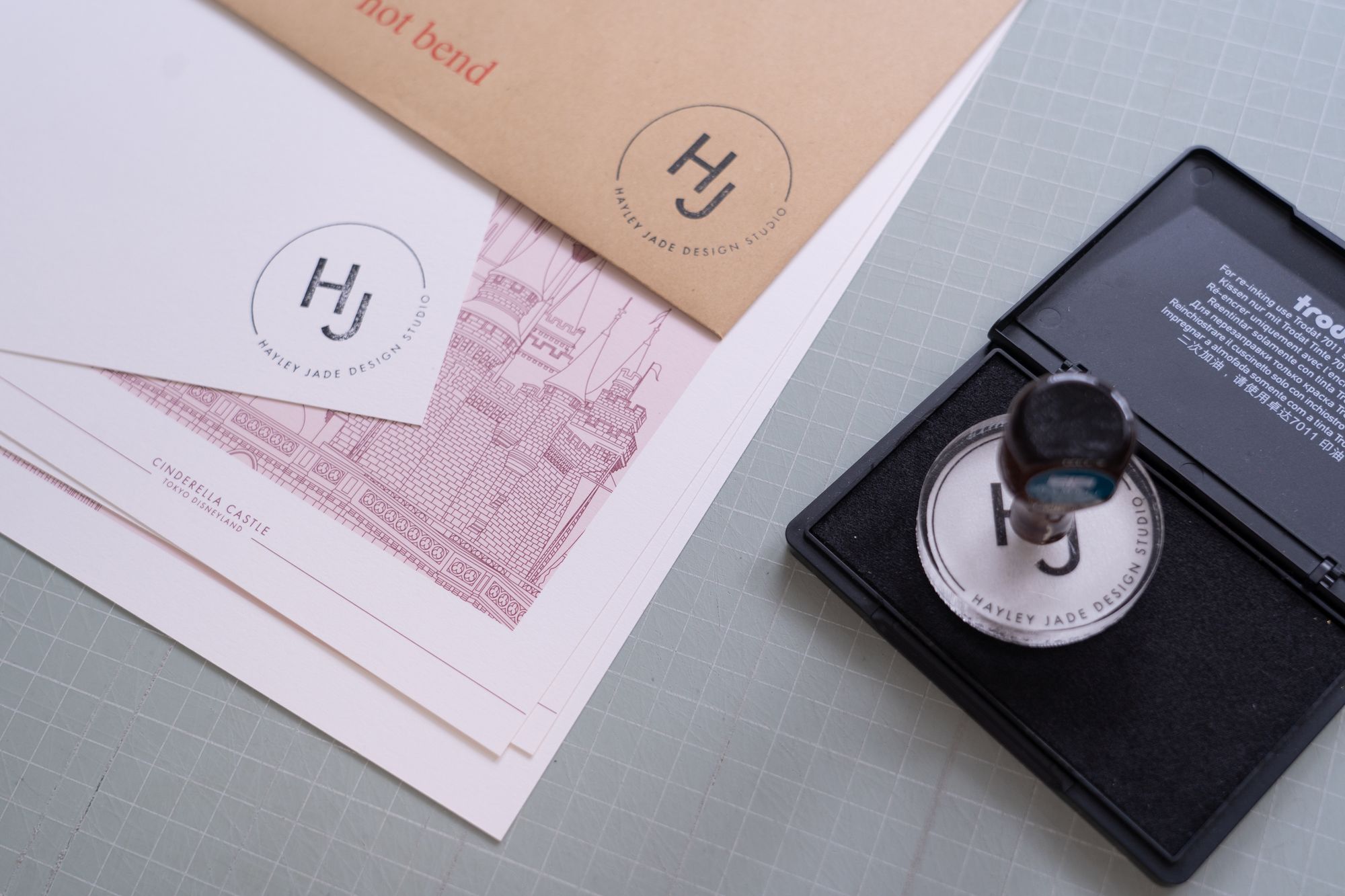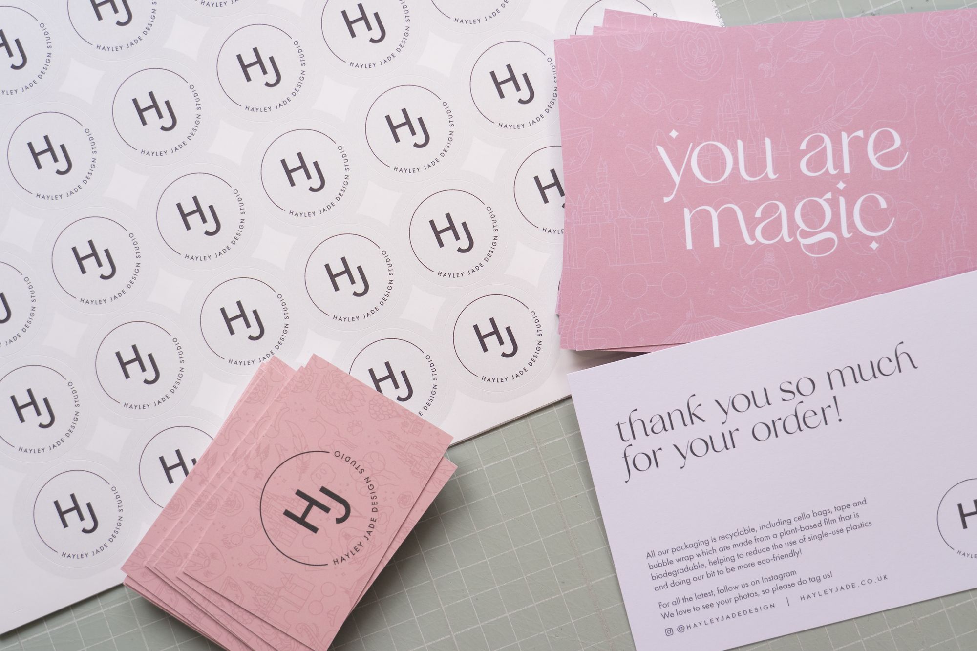 One of the most cost effective ways I've found of adding branding is to use a stamp. I use my stamp on the back of some of my products such as prints and notepads, as well as on packaging, so when it arrives through someone's letterbox, they instantly know where the package is from. I use branded stickers too, and I add thank you compliment slips in every order - these are great for adding essential bits of information such as website and social media links and I have also added information about my packaging, letting the customer know that everything is recyclable and/or biodegrade-able. If I get some packaging in an order that doesn't say anywhere that it's recyclable, I'll just automatically bin it, so little bits like this will make a difference!