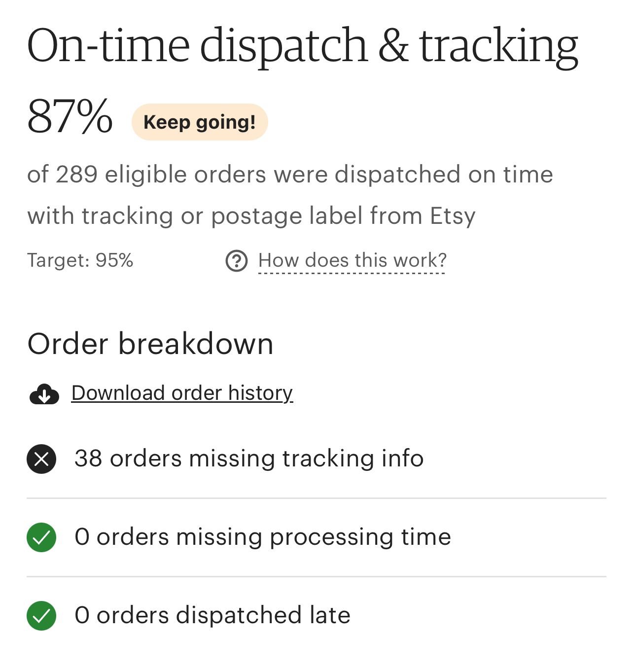 The above screenshot is the latest stats for this month. My percentage is only as high as it is because the vast majority of my orders are under £10. But you can see from the screenshot that because 38 orders didn’t have tracking (I’d say the majority of my over £10 orders are less than £20) I sit at 87%, which has always been the case since this thing started. And people are not going to pay half the amount they had paid for the product again for tracking. I know I wouldn't! If Etsy are insisting on adding tracking, I definitely think the threshold needs to be raised to at least £20.