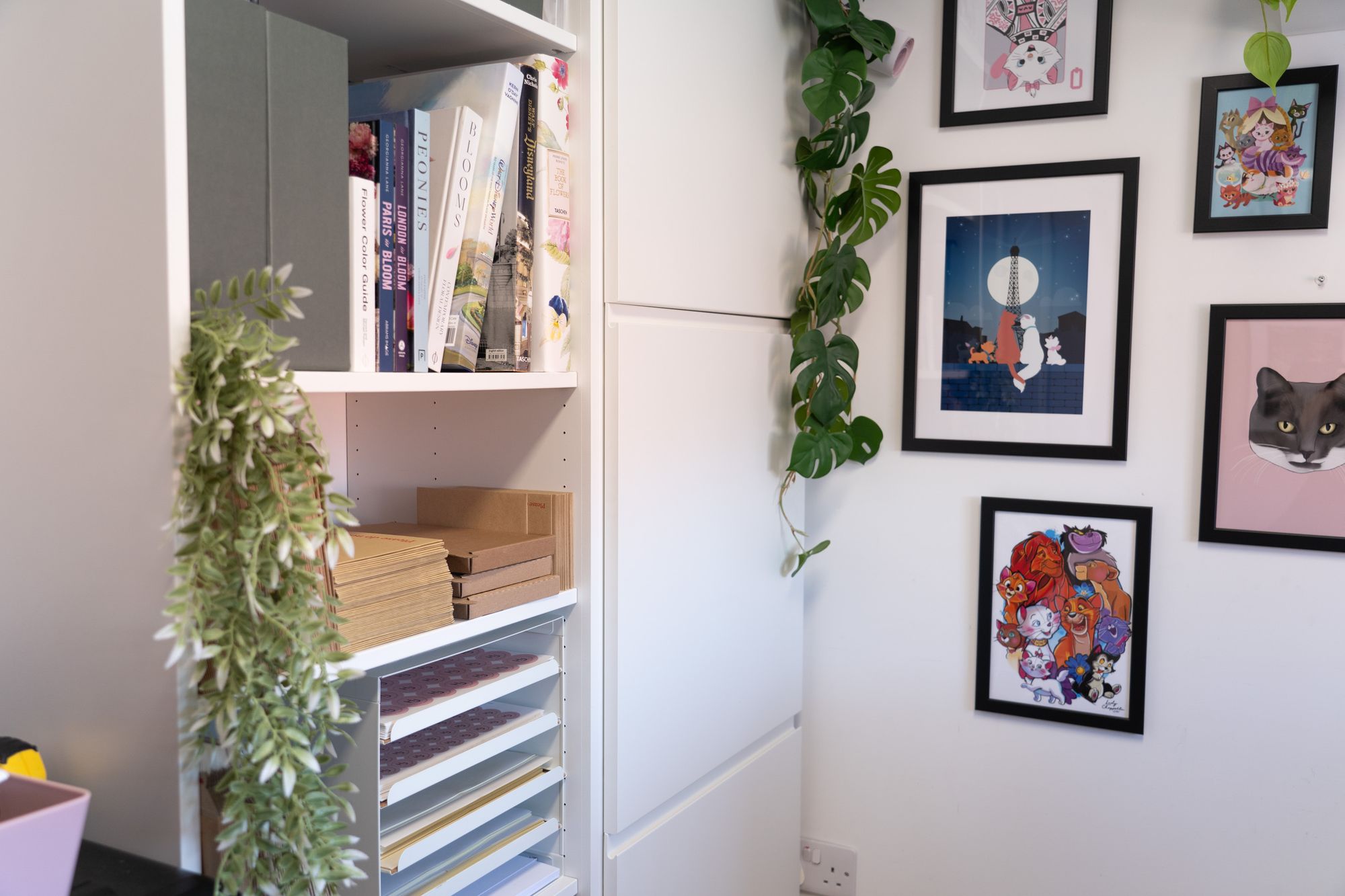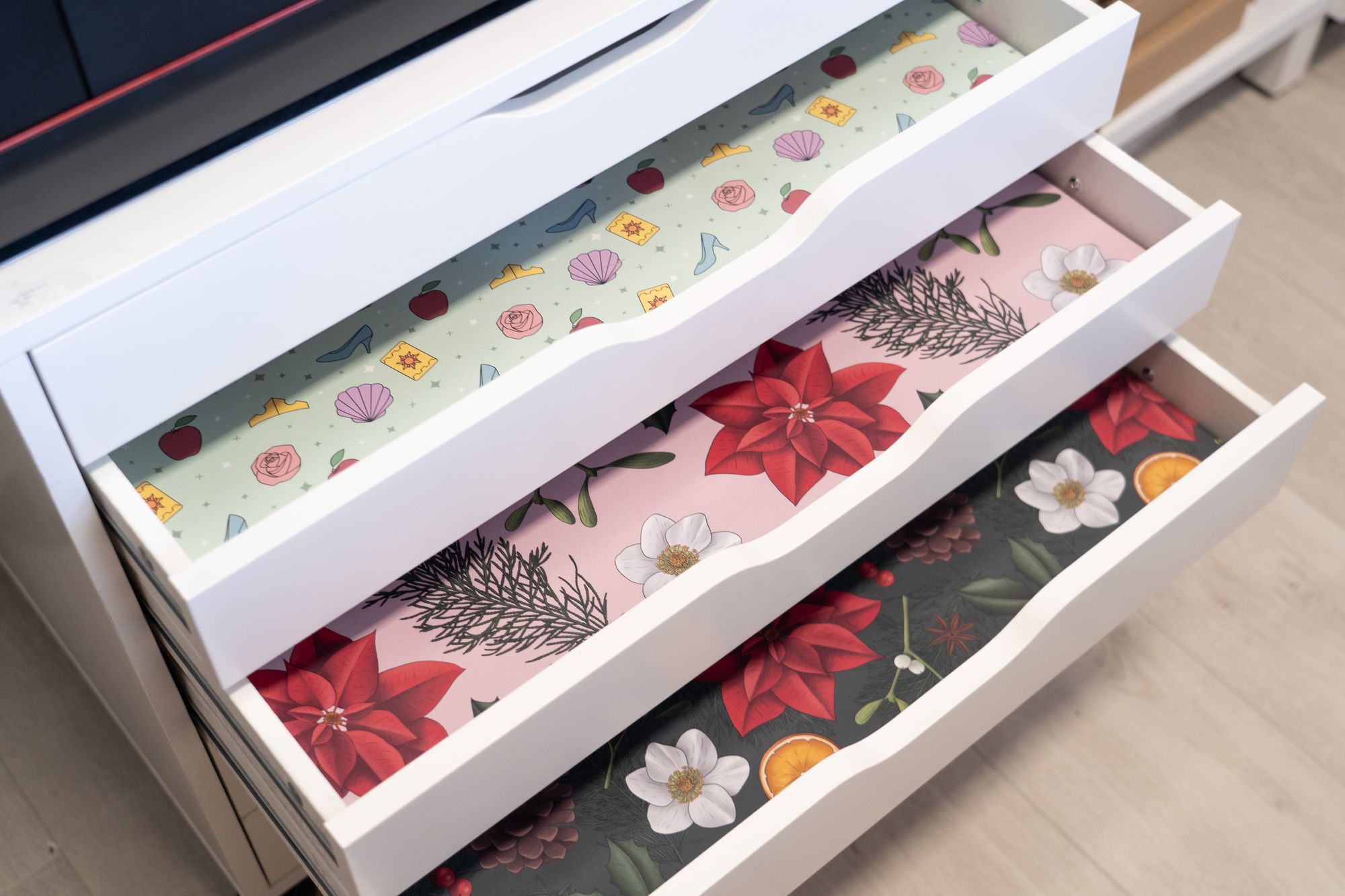These drawers from Ikea are perfect for storing my A2 sized wrapping paper. Although I don't send the paper out flat, it takes up way too much room to fold them all beforehand, so this is how I store the paper until they're to be packed.