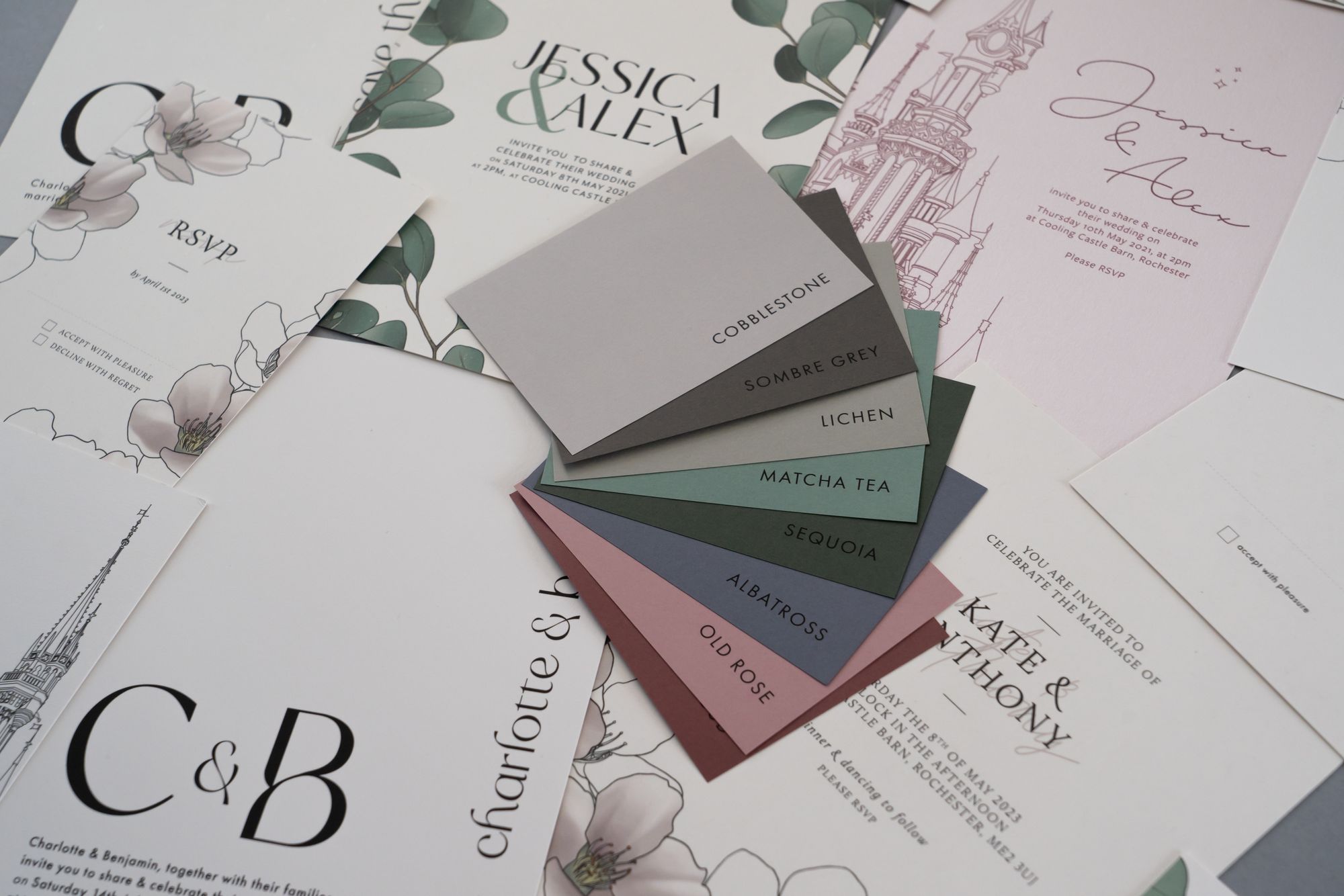 Sample packs are also available to buy through the shop too, so that you can get an idea for the papers and designs before taking the plunge to order. Each pack will include samples of the envelope colours as well as the paper options and sizes available for the invitations designs, so that you can feel and see what your invitations may look like!