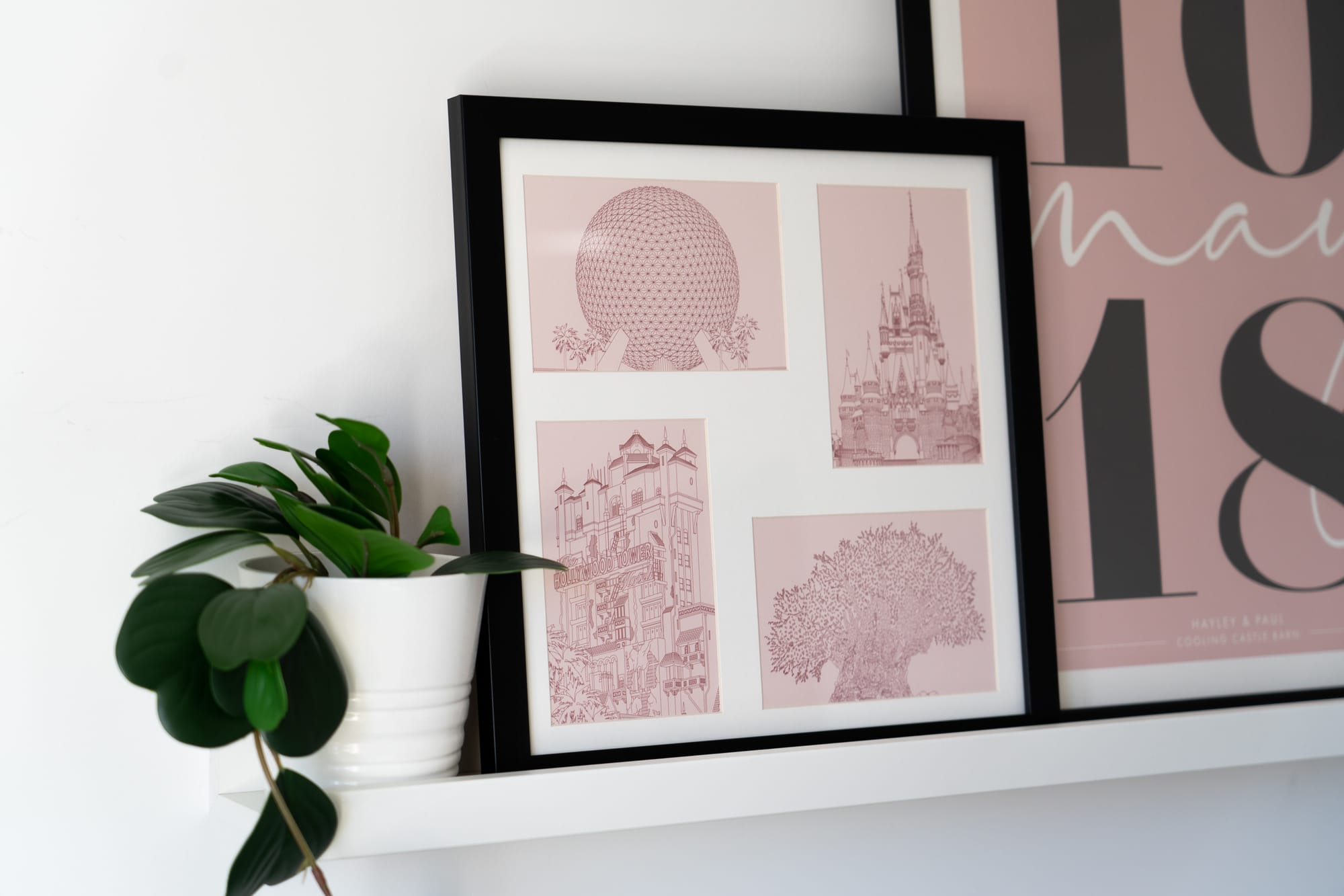Around the same time, we had just come back from our honeymoon to Walt Disney World and I decided I wanted some prints of both the Disneyland Paris and WDW castles for our home, but I wanted something a bit less colourful and more minimal (you wouldn't think looking at my work and home now), so I drew the two castles as line art illustrations. I posted these on my instagram at the time, and got really positive responses to the Disney prints, so when I launched my first full range of products in May 2019, I included the two prints in my shop, alongside botanical drawing and personalised typography prints.